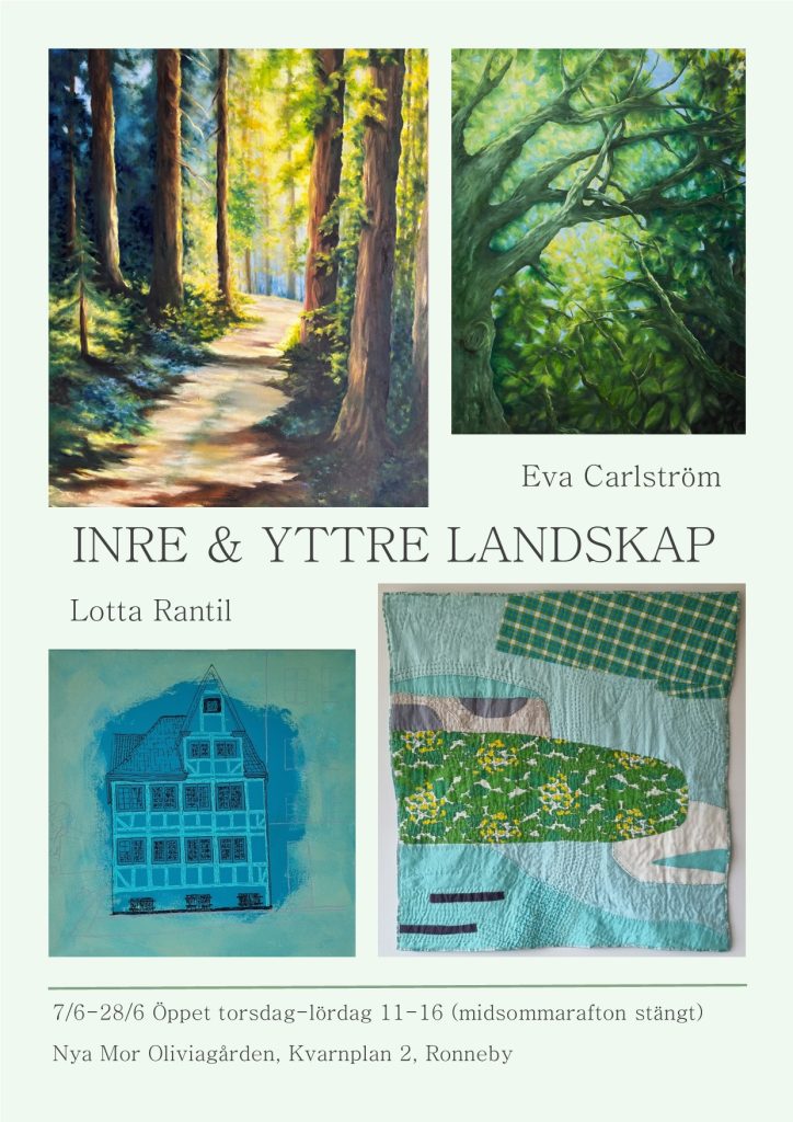 Utställningen INRE & YTTRE LANDSKAP med Lotta Rantil och Eva Carlström pågår från den 7/6 t.o.m. 28/6 på Nya Mor Oliviagården, Kvarnplan 2, Ronneby.
