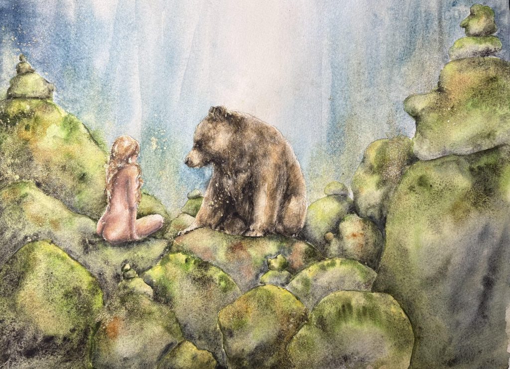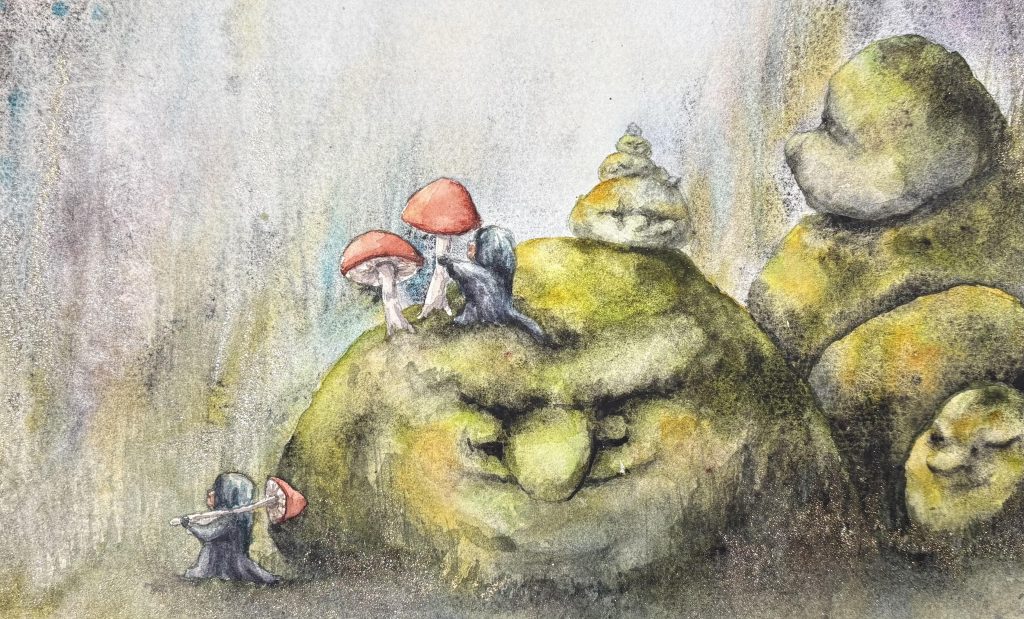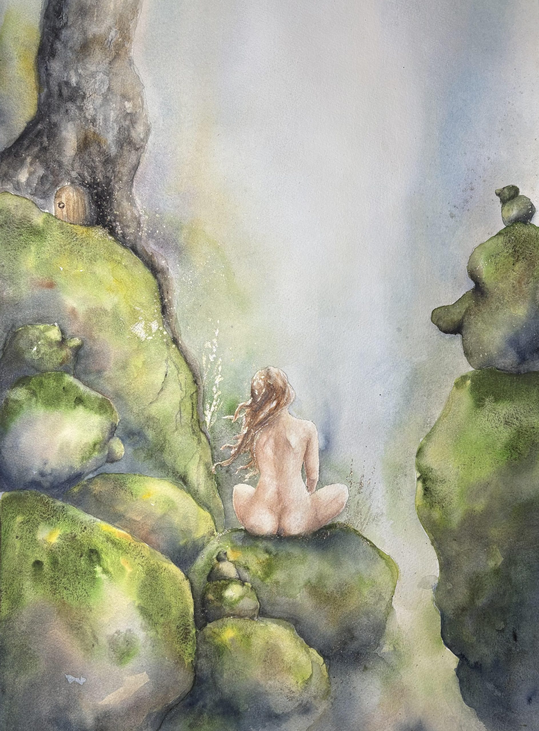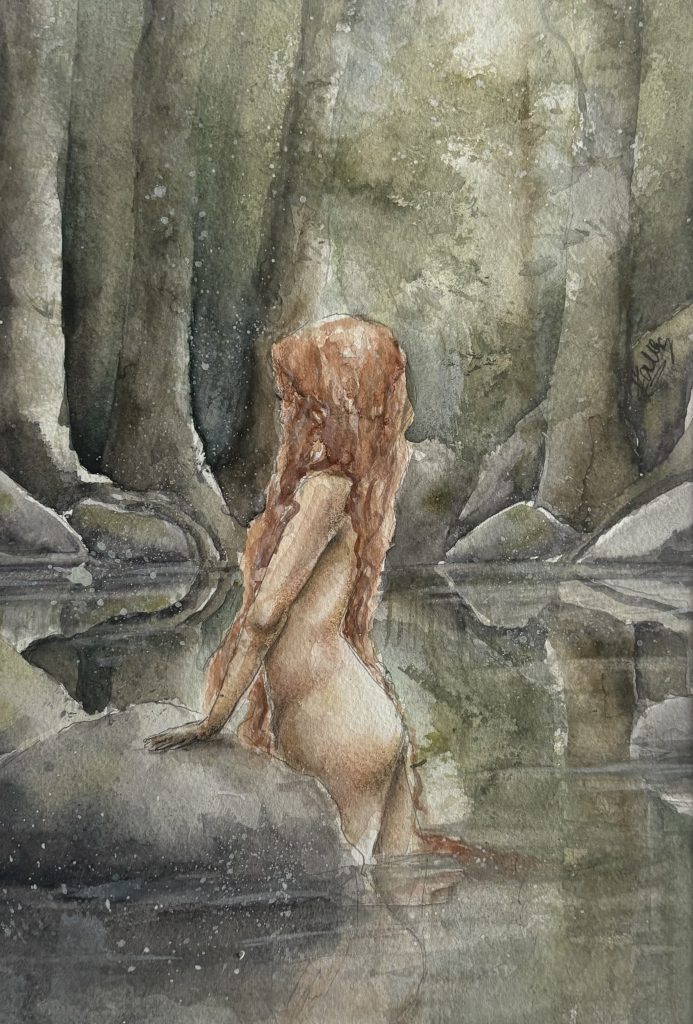 Min stora inspirationskälla är skogen, den djupa urskogen med mossbeklädda berg och stenar, uråldriga träd, djupa och mörka skogstjärnar. Men framförallt är det alla de väsen och varelser som lever i skogen som jag fascineras av och gärna vill berätta om i min konst. Jag älskar att lyssna till historier om skogsrået, vättar, näcken, sjörået, bäckahästen, vittror, älvor, troll mm. Jag fantiserar om hur det skulle vara att möta dessa fantastiska och mytomspunna väsen och det är detta jag gärna lyfter i mina målningar.