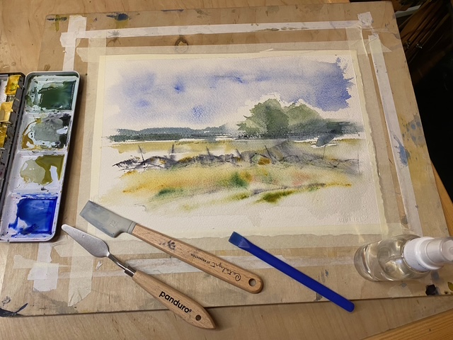 Jag målar akvarell och akryl, och under den varma årstiden sitter jag gärna med mitt akvarellblock på plats med motivet framför mig. Motiven hittar jag i naturen, ofta vid havet. Ett foto eller en skiss blir underlag och inspiration när jag målar hemma i Ronneby eller på ”Öppen ateljé ” hos Evas konstateljé.